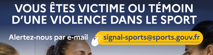 Depuis 2019, le Ministère des Sports, de la Jeunesse et de la Vie Associative a mis en place une cellule nationale de recueil et traitement des signalements de violence dans le sport. Cette cellule « Signal-Sports » agit conjointement avec de nombreuses institutions, à la fois sportives (fédérations sportives, INSEP, CREPS, écoles nationales) et juridiques (119, 3018, services de police et de justice, etc.). Toute personne victime ou témoin (direct ou indirect) peut écrire à Signal-Sports, qu’il s’agisse du milieu sportif amateur ou de haut-niveau. Pour cela, il suffit d’adresser un mail à l’adresse suivante : signal-sports@sports.gouv.fr.